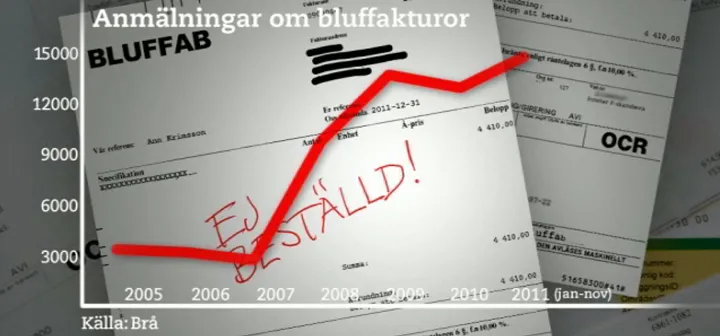 Polisanmälningar om bluffakturor har ökat från 3 390 under hela 2005 till 14 924 de elva första månaderna 2011. En ökning med 340 procent eller fyra och en halv gånger. Siffrorna kommer från Brottsförebyggande Rådet, Brå.