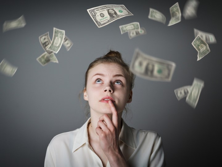 Kvinna under ett regn med sedlar