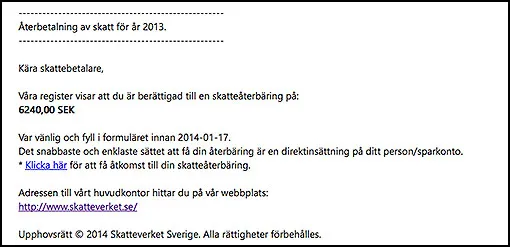 Ämnet är återbetalning av skatt och avsändaren vill att man ska klicka på länken för att få sin skatteåterbäring. Något du alltså inte ska göra, utan slänga det direkt.