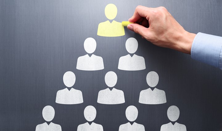 Foto: Leader of company organization. Human resource management and leadership concept. Businessman drawing pyramid structure on chalkboard.