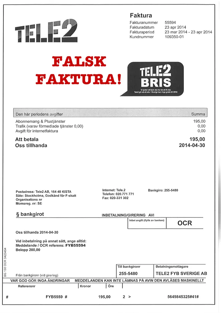 Betala INTE den falska fakturan från "Tele2"!