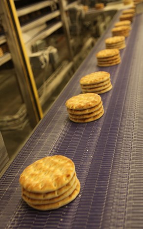 I ena änden av produktionskedjan fylls stora kar med mjöl och andra ingredienser som får jäsa. När degen är klar börjar själva tillverkningsprocessen med kavling, stansning och bakningen i de heta ugnarna.