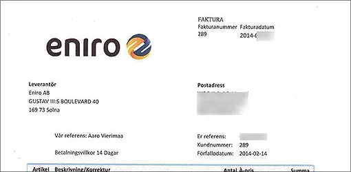 På den falska fakturan finns Eniros logga med, liksom organisationsnummer och adress.