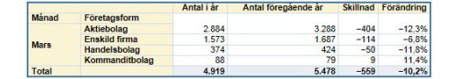 Färsk statistik från Bolagsverket (se bild) visar att i mars i år startades alltså 559 färre företag jämfört med mars förra året. Siffrorna avser de fyra vanligaste företagsformerna – aktiebolag, enskild näringsidkare, handelsbolag och kommanditbolag.