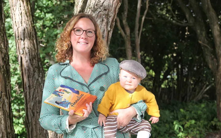 Angeli har två bebisar, en på var arm: Andra barnet som är sex månader och boken Annalisa och födelsedagspresenten, ett par veckor gammal.