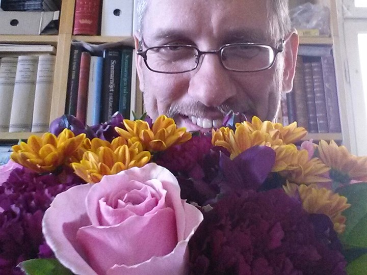 Foto: Anders Nyman med blommorna han fick som tack då han hjälpte läsaren