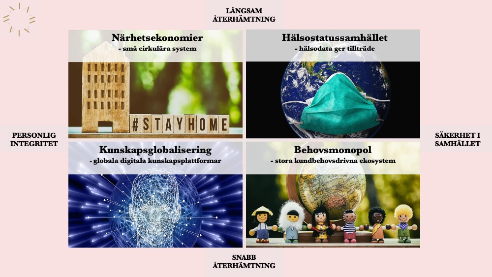 – Vi tittar på utvecklingen och har skapat fyra tänkbara scenarier – fyra olika riktningar som världen kan ta. Det är en välbeprövad metodik och det är viktigt att det är just fyra och inte tre, för då finns det oftast en gyllene medelväg man frestas att välja. Alla framtidsbilder ska kunna inträffa, även om de kanske inte blir så extrema som vi målar upp dem, säger Charlotte Mattfolk.