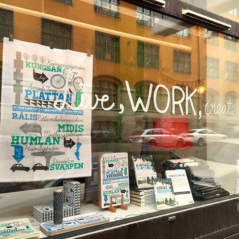 [caption id="attachment_20101" align="aligncenter" width="470"]Omskyltat! Det är bra med ett skyltfönster mot gatan. Här visas min kollektion “nållåtta” och en roman som min författarkollega skrivit. Omskyltat!