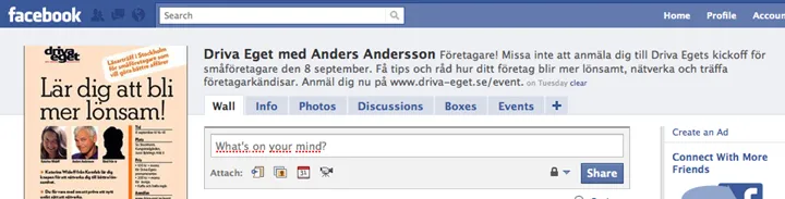 Mer än 700 personer har gått med i Driva Egets fansida på Facebook för att få nyheter och bli inbjudna till företagarevents. Gör det du också - och skapa din egen sida på Facebook till ditt företag. Se här hur du gör.