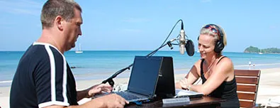 De får mejl till sin bärbara dator med order om vad kunderna vill ha inläst till sina kundtjänster. Efter morgondoppet i havet på Thailändska Koh Lanta kopplar teknikern Vello upp sig mot en studio i Stockholm och Johanna talar in en lång rad meddelande, innan det är dags för strandpromenad.