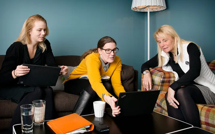 Vi går runt i Lernias lokaler i jakt på en bra miljö att fotografera i. Fotografen Maria har hittat en fin soffhörna där det sitter ett par och diskuterar en excelfil på datorn framför sig.