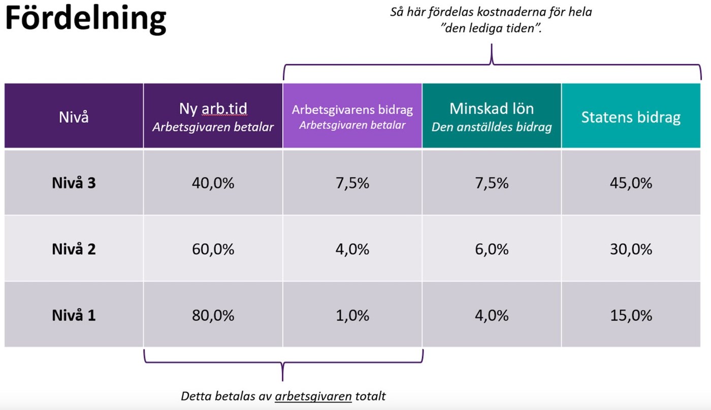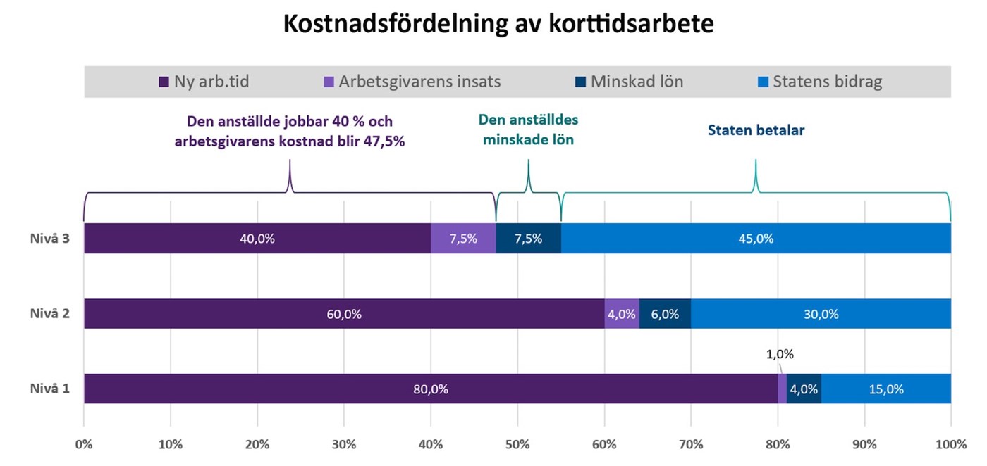 På Tillväxtverkets hemsida finns två bra bilder som visar "kostnadsfördelningen av korttidsarbete" och "procentuell fördelning"