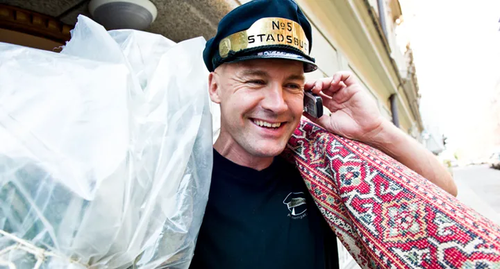 "Att vara stadsbud är mer än vad man kan tro. Det handlar inte bara om att flytta grejer. Man gör allt från att vindsröja och hjälpa en gammal dam med att handla, till att planera och genomföra en enorm kontorsflytt. När ett kontor med 200 arbetsplatser släcker lampan på fredagen och tänder den i sin nya lokal på måndagen, ska de kunna fortsätta jobba som om ingenting har hänt. Det ser vi till att de kan.Men så är det heller inte lätt att bli stadsbud i vår firma. Alla är delägare i något av de fyra handelsbolag som Stadsbud i Storstockholm AB är uppbyggt av. Där har vi höga krav. Först måste du gå på prov i tre månader, sedan röstar vi – och majoriteten måste säga ja för att du ska få provjobba i två år. Efter sammanlagt 27 månader röstar vi igen om du ska få bli ordinarie, det vill säga delägare.