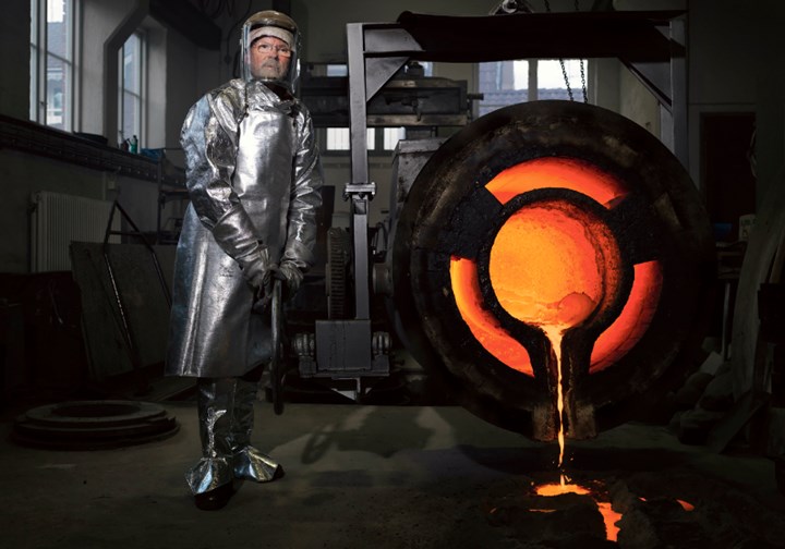 När bilden togs hade jag en specialdräkt på mig för att skydda mig från värmen, det kan bli upp till 1 100 grader när bronset hälls ned i gjutformen som jag tillverkat."