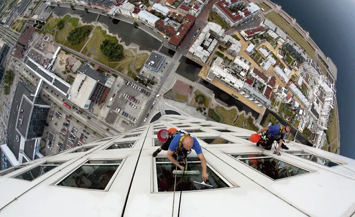 På bilden syns småföretagaren Jon Enström som driver en fönsterputsfirma i Malmö och som tidigare intervjuats i Driva Eget. Här putsar han fönstren på Turning Torso.