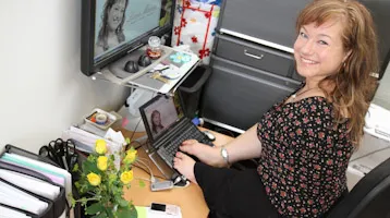Sedan dess sköter hon en stor del av bokföringen i sitt företag själv. Pärmar och skrivande hanterar hon problemfritt med sina fötter. Stressad är hon aldrig: