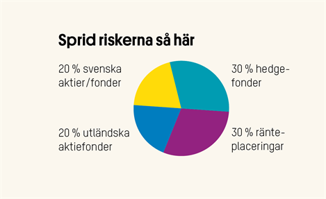 Jag rekommenderar hedgefonder, trots att avgifterna är oförskämt höga. Om du då väljer en hedgefond som rör sig på annat sätt än aktieindex har du spritt riskerna väl.