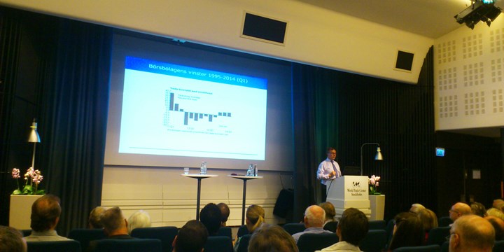 – Vinsterna vänder uppåt. Det går bra nu! Alla ni som sitter här kommer att vara rikare om ett år än ni är idag. Men många aktiebolag har en väl hög värdering, sa han och visade en kavalkad av diagram för att styrka vad han sagt.