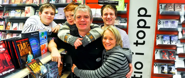 En som vet är Stephan Jönnå som tillsammans med kollegan Pia Zvorc öppnade Ale Bokhandel utanför Göteborg. På bilden syns han med sin fru och sin fyra barn.