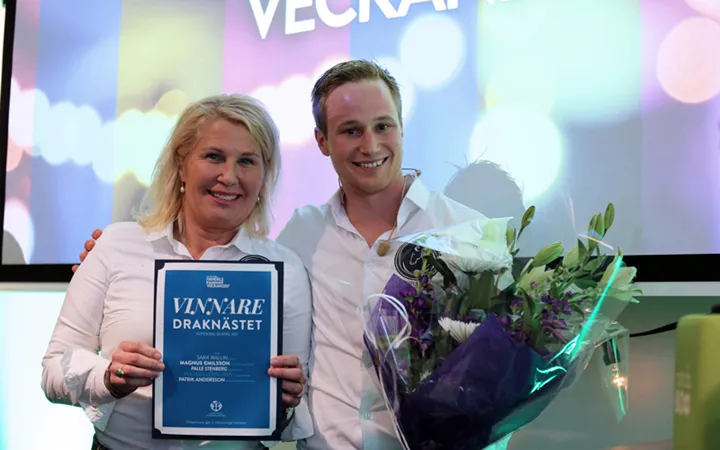 Foto: Marianne Lilja Wittbom, medgrundare, och Linus Jernbom, vd, tar emot pris på Draknästet som Västsvenska Handelskammaren anordnade i Göteborg.