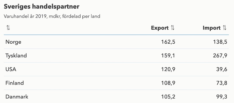 - Sveriges största handelspartners är i tur och ordning Norge, Tyskland, USA, Finland och Danmark. (Ekonomifakta 2019). Se diagram nedan.