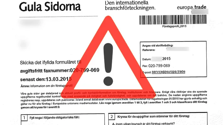 Faxblanketten har titeln Gula Sidorna – den internationella branschförteckningen, och ger sken av att vara en obligatorisk uppdatering. Den som skriver under och returnerar till det kostnadsfria svenska faxnumret tecknar ett införande i internetkatalogen Europa Trade på två år, med ett års förlängning om avtalet inte sägs upp i tid.