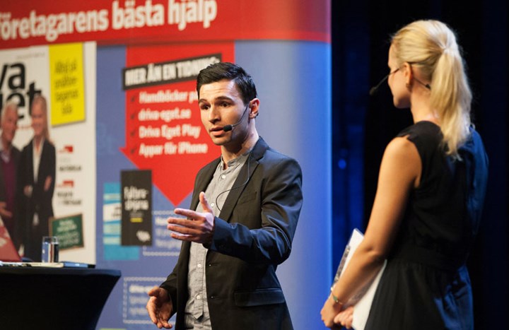 Foto: Telias representant på scen under Driva Eget-dagen. Foto: Hans Fridén.