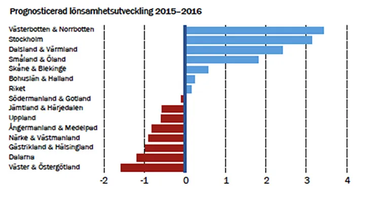 Stockholmsföretagen, som abonnerat på jumboplatsen tidigare till följd av högre kostnadsläge (nästan tio procentenheter över rikssnittet), tar nu ett kliv uppåt. I stället ramlar regionen Ångermanland & Medelpad ner till sistaplatsen på listan.