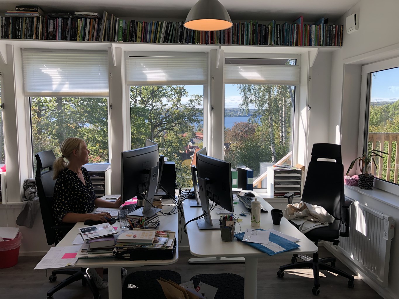 Att ha kontoret hemma är som sagt ett sätt att hålla nere kostnaderna. Men det handlar också om att kunna finnas nära barnen. Hon kan se till att jaga upp dem till skolan om någon skulle blivit sen, eller kan reda ut konflikter om det skulle krävas.