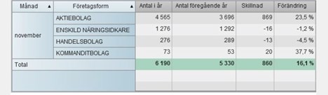 Under november ökade nyföretagandet i Sverige med hela 16 procent samtidigt som antalet konkurser fortsätter att minska.