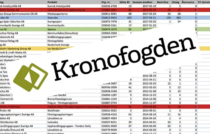 På Förenade Bolags varningslista, som är den mest heltäckande listan över fakturaskojare, finns drygt 400 bluffar listade. Av dessa bad vi Kronofogden kontrollera samtliga svenska organisationsnummer, både från blufföretagen och företag som de använt som betalningsmottagare på fakturorna. För att undvika krav som rimligen inte rör bluffakturor bad vi myndigheten att utesluta krav större än ett halvt basbelopp, 22 400 kronor.