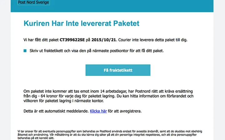 Postnord AB varnar för ett nytt mejl som sprids till företag och privatpersoner och ser ut att komma från Postnord. Via en länk i mejlet sprids ett virus på datorn.Ett bluffmejl som ser ut att komma från Postnord sprids just nu till företag och privatpersoner, klickar du på länken i mejlet sprids ett virus på datorn. Mejlet handlar om ej levererade paket.