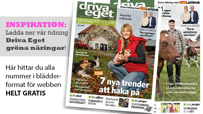 Du har väl inte missat vår systertidning – Driva Eget Gröna näringar? Fylld av företagarinspiration för dig som driver eget på landsbygden, men även för dig i stan. Här kan du läsa alla nummer i blädderformat direkt på webben.